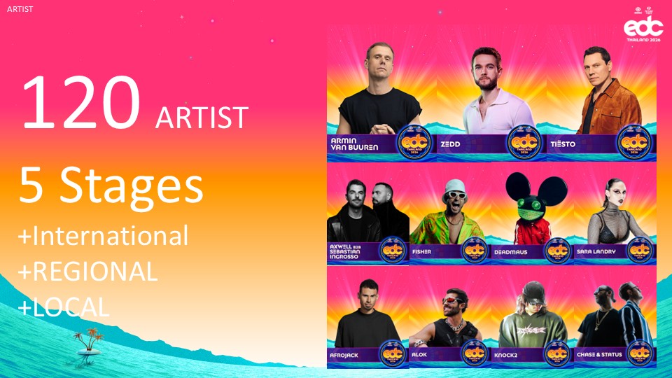 งาน EDC Thailand 2026 มีกำหนดจัดขึ้นระหว่างวันที่ 16–18 มกราคม 2569 ณ Rhythm Park จังหวัดภูเก็ต ภายใต้คอนเซปต์หลัก “Bigger, Brighter, and More Immersive Than Ever” โดยในปีนี้งานจะขยายสเกล อย่างมีนัยสำคัญ ทั้งด้านพื้นที่ โปรดักชัน และประสบการณ์ ซึ่งถือเป็นครั้งแรก ที่จะมีการนำมาตรฐานการผลิต เต็มรูปแบบระดับเดียวกับ EDC Las Vegas มาสู่ประเทศไทย