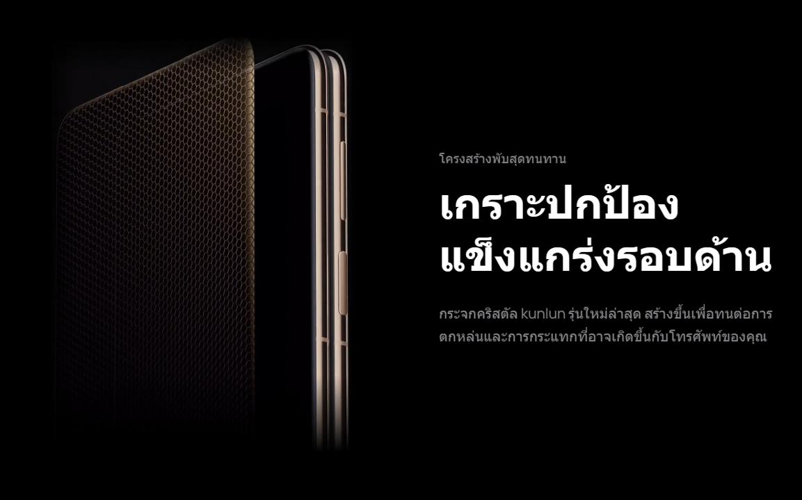 HUAWEI Mate X7 คือสมาร์ทโฟนจอพับที่แกร่งรอบด้านอย่างแท้จริง โดยหัวใจสำคัญของความทนทานในทุกมิติ เริ่มต้นจากหน้าจอด้านนอกที่แข็งแกร่งขั้นสุด เพราะมาพร้อมเทคโนโลยีกระจกคริสตัล Kunlun รุ่นใหม่ล่าสุด ที่ใช้นวัตกรรมการประมวลผลระดับนาโนในการผลิต จึงให้ความทนทานขั้นสูงเป็นพิเศษ ช่วยปกป้องหน้าจอจากการตกกระแทกและรอยขีดข่วนได้อย่างหายห่วง มอบอิสระให้คุณใช้งานได้อย่างเต็มที่ในทุกสถานการณ์