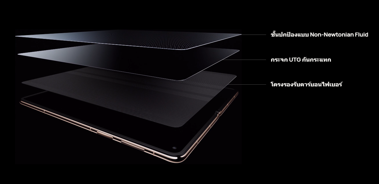 ในขณะที่หน้าจอด้านในที่เป็นหัวใจสำคัญของการพับเก็บ หัวเว่ยเป็นรายแรกของอุตสาหกรรมที่ใช้โครงสร้างหน้าจอภายในแบบคอมโพสิต 3 ชั้นที่ทนทานเป็นพิเศษ โดยหน้าจอภายในของ HUAWEI Mate X7 ผสานชั้นปกป้องแบบ Non-Newtonian Fluid และกระจก UTG กันกระแทก รวมถึงโครงรองรับคาร์บอนไฟเบอร์ เข้าด้วยกันอย่างชาญฉลาด ผลลัพธ์คือความยืดหยุ่นและความแข็งแกร่งที่เหนือกว่า ทำให้หน้าจอด้านในทนต่อการโค้งงอได้เพิ่มขึ้นถึง 100% และทนต่อแรงกระแทกได้เพิ่มขึ้นถึง 20% เมื่อเทียบกับรุ่นก่อนหน้า วางใจได้ด้วยการพับที่ไร้ที่ติและยืดหยุ่น