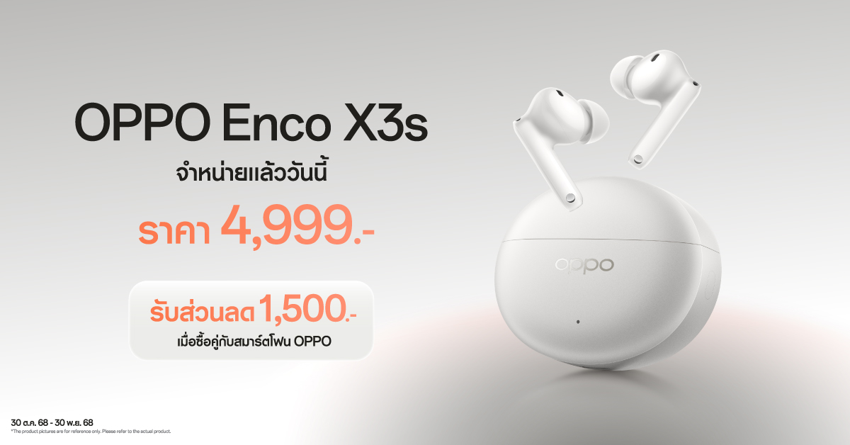 ในงานเดียวกันนี้ ออปโป้ยังเปิดตัวพร้อมกับ OPPO Enco X3s หูฟังไร้สายระดับแฟลกชิปให้ดื่มด่ำกับโลกแห่งเสียงด้วยระบบตัดเสียงรบกวน 55dB แบบเรียลไทม์ ครอบคลุมช่วงความถี่กว้างถึง 5,500Hz คุยชัดแม้อยู่ในที่คนเยอะด้วยเทคโนโลยี AI 3 ไมโครโฟน และโหมดปรับอัตโนมัติให้เหมาะกับสภาพแวดล้อม เปิดประสบการณ์เสียงใส คมชัด ด้วยการปรับจูนโดย Dynaudio พร้อมพลังเสียงรอบทิศทาง OPPO Alive Audio และเสียงคุณภาพระดับ Hi-Res LHDC 5.0 เชื่อมต่ออัจฉริยะได้พร้อมกันสองอุปกรณ์ และเพลิดเพลินกับทุกท่วงทำนองได้นานสูงสุด 45 ชั่วโมง ด้วยแบตเตอรี่ที่อึดและชาร์จไว ในราคา 4,999 บาท พร้อมส่วนลดพิเศษเมื่อซื้อคู่กับสมาร์ตโฟนออปโป้รุ่นใดก็ได้ ทันที 1,500 บาท