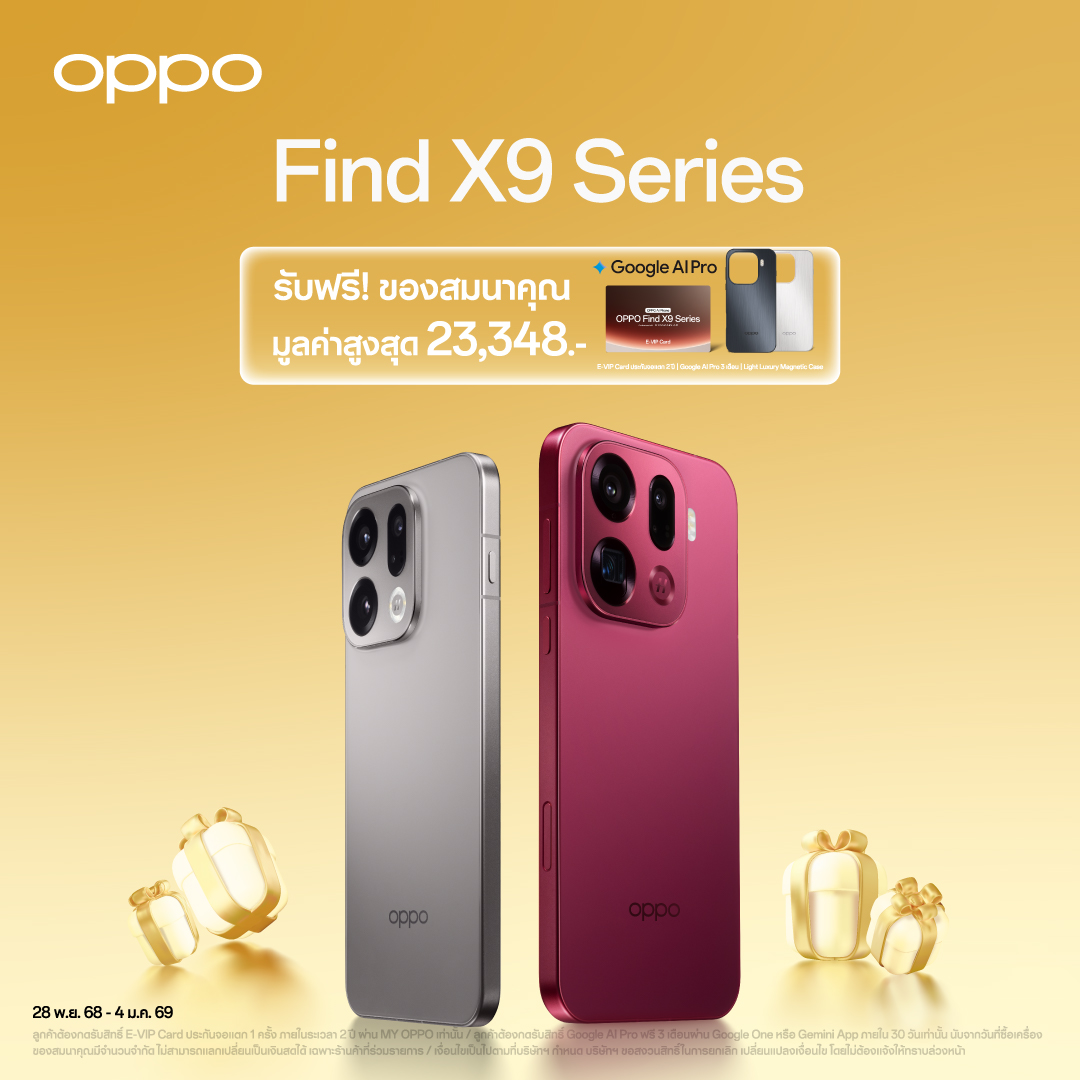 สัมผัสประสบการณ์ซูมดีทุกคอนเสิร์ตด้วยกล้อง 200MP Hasselblad Telephoto จาก OPPO Find X9 Pro มอบภาพถ่ายคมชัดทุกรายละเอียด แม้ครอปภาพก็ยังคงความคมชัดเหนือระดับ และในรุ่น OPPO Find X9 Pro และ OPPO Find X9 มาพร้อมพลังซูมไกล 120x Super Zoom และการบันทึกวิดีโอความละเอียดสูงระดับ 4K 120fps มาพร้อม Stage Mode ที่รองรับทั้งการถ่ายภาพและวิดีโอให้เก็บทุกอารมณ์และจังหวะของศิลปินได้อย่างสมบูรณ์แบบ มาพร้อมสีใหม่ “Velvet Red” สีแดงสุดพรีเมียม โดยเมื่อซื้อ OPPO Find X9 Pro และ OPPO Find X9 รับฟรี E-VIP Card ประกันจอแตก 1 ครั้ง ภายในระยะเวลา 2 ปี, ฟรี Google AI Pro 3 เดือน, Light Luxury Magnetic Case มูลค่ารวม 23,348 บาท และมูลค่ารวม 19,348 บาท ตามลำดับ