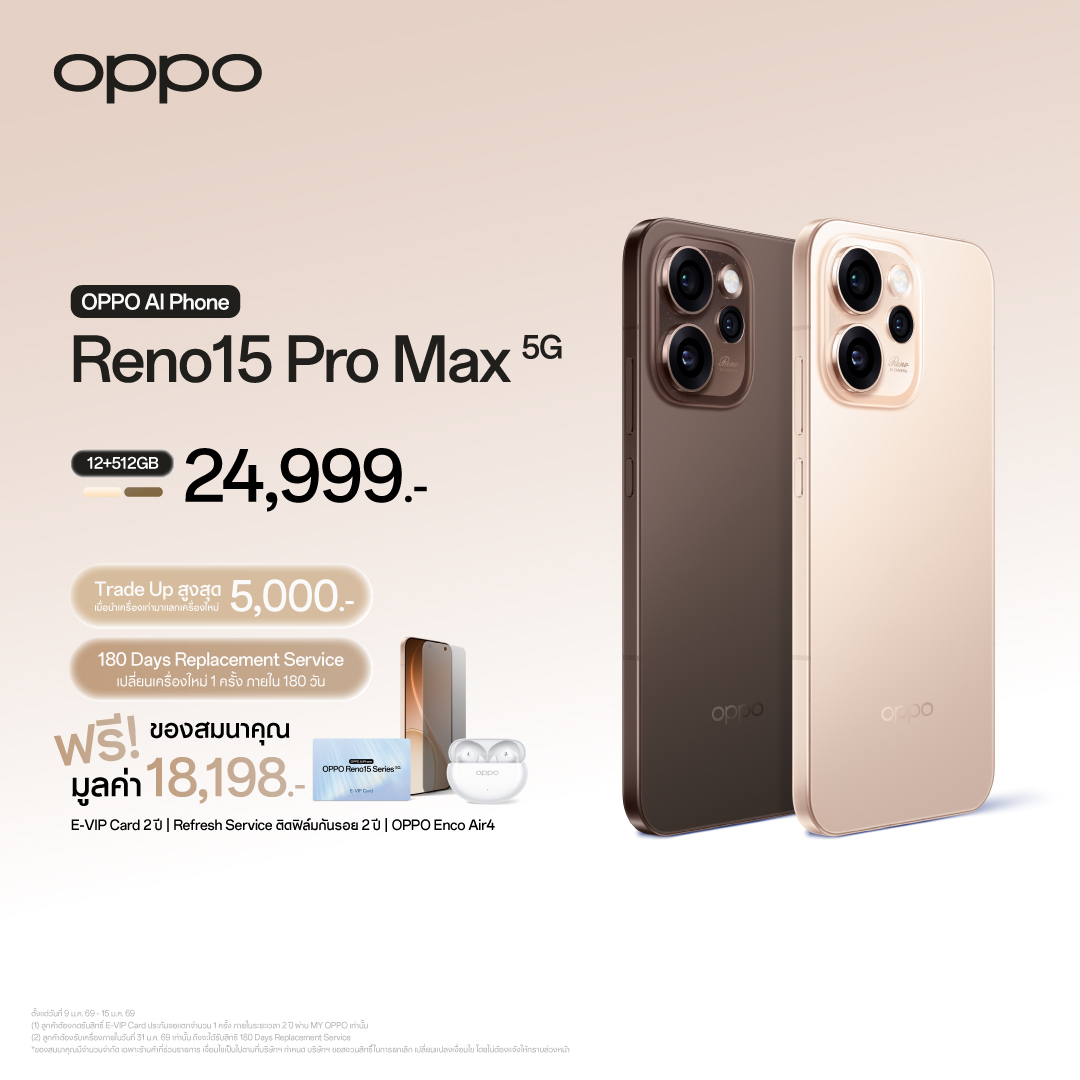 - OPPO Reno15 Pro Max 5G(12+512GB) มีให้เลือก 2 สี ได้แก่ สีทอง Aura Gold และสีน้ำตาล Dusk Brown วางจำหน่ายในราคา 24,999 บาท