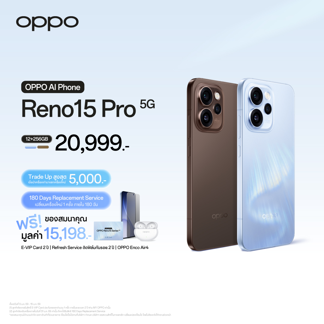 - OPPO Reno15 Pro 5G (12+256GB) มีให้เลือก 2 สี ได้แก่ สีฟ้า Aurora Blue และสีน้ำตาล Dusk Brown วางจำหน่ายในราคา 20,999 บาท