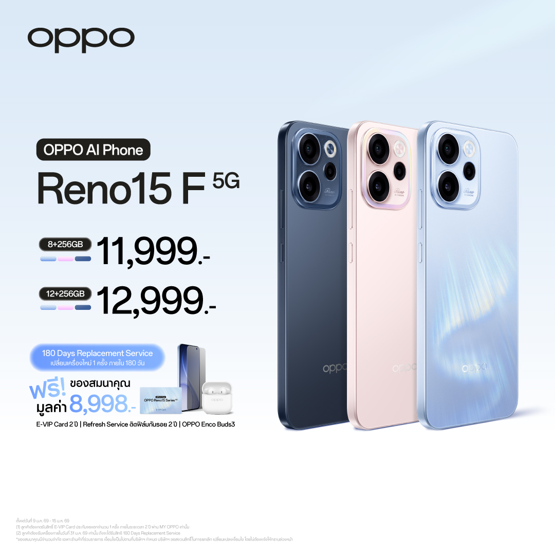 สำหรับผู้ที่สนใจเป็นเจ้าของ OPPO Reno15 Series 5G สามารถสั่งจองเครื่องได้ตั้งแต่วันที่ 9 – 15 มกราคม 2569 โดยผู้ที่รับเครื่องภายในวันที่ 31 มกราคม 2569 จะได้รับสิทธิ์ 180 Days Replacement Service เปลี่ยนเครื่องใหม่ได้ฟรี 1 ครั้ง หากเครื่องเสียหายภายใต้เงื่อนไขประกันภายใน 180 วัน พร้อมกับของสมนาคุณพิเศษอีกมากมาย ดังนี้