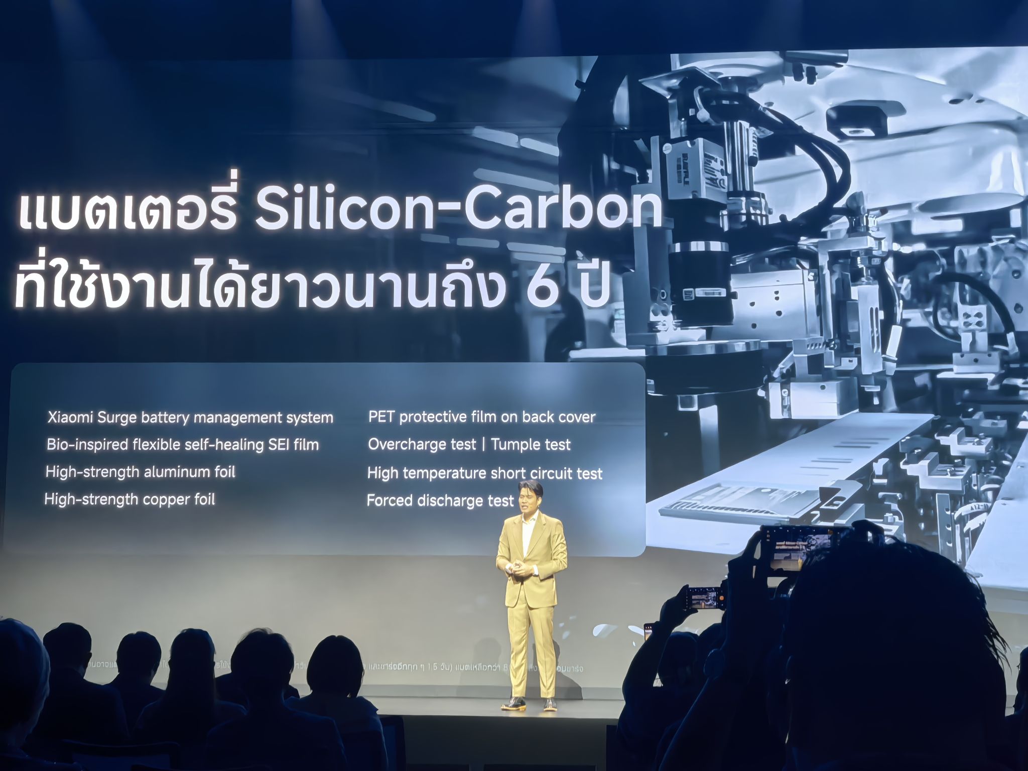 2 อ้างอิงจากการคำนวณเชิงทฤษฎีโดยใช้ข้อมูลการทดสอบจากห้องปฏิบัติการภายในของ Xiaomi โดยจำลองพฤติกรรมการใช้งานประจำวันของผู้ใช้ (ชาร์จและใช้งานครบหนึ่งรอบทุก 1.5 วัน) แบตเตอรี่ยังคงความจุไม่น้อยกว่า 80% หลังผ่านรอบการชาร์จ 1,600 รอบ ซึ่งเทียบเท่าการใช้งานทั่วไปมากกว่า 6 ปี ผลลัพธ์จริงอาจแตกต่างกันไปตามสภาพการทดสอบและพฤติกรรมการใช้งาน