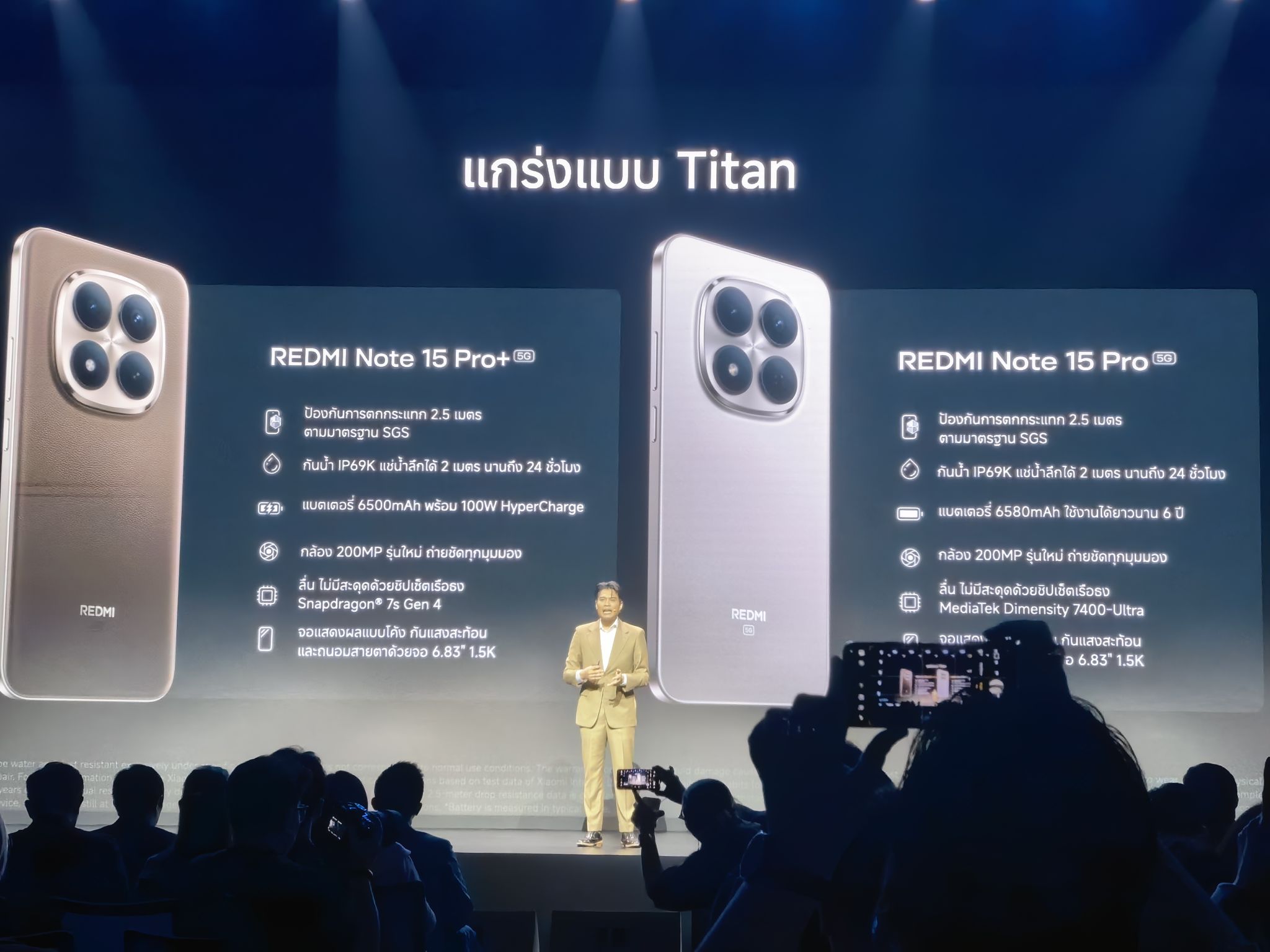 ผลิตภัณฑ์ในทุกๆ รุ่นมาพร้อมความทนทานระดับ REDMI Titan ซึ่งได้ผสานรวมแบตเตอรี่ที่ใช้งานได้ยาวนาน ความทนทานต่อการตกกระแทก และการป้องกันฝุ่นและน้ำมาไว้ให้อย่างครอบคลุม เพื่อยกระดับมาตรฐานความแข็งแกร่งใหม่ให้กับสมาร์ทโฟน REDMI Note Series ทั้งนี้สมาร์ทโฟนรุ่น REDMI Note 15 Pro+ 5G และ REDMI Note 15 Pro 5G เป็นผู้นำของซีรีส์นี้ด้วยฟีเจอร์ด้านความทนทานที่ล้ำหน้าที่สุด ในขณะที่ทุกรุ่นได้รับการออกแบบมาเพื่อตอบโจทย์การใช้งานในชีวิตประจำวัน