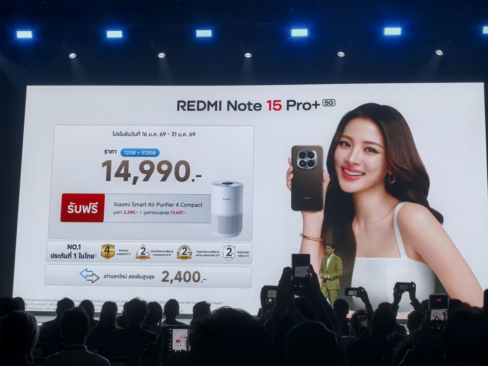 พิเศษ! สำหรับลูกค้าที่ซื้อ REDMI Note 15 Pro+ 5G ในระหว่างวันที่ 16-31 มกราคม 2569 รับฟรี Xiaomi Smart Air Purifier 4 compact, รับประกันแบตเตอรี่ 4 ปี35, รับประกันความเสียหายจากของเหลว 2 ปี35, รับประกันความเสียหายของหน้าจอหรือฝาหลัง 2 ปี35 และรับประกันตัวเครื่อง 2 ปี35 รวมมูลค่าของสมนาคุณ 13,687 บาท34 นอกจากนี้ยังนำเครื่องเก่ามาแลกใหม่และรับส่วนลดเพิ่มสูงสุด 2,400 บาท34