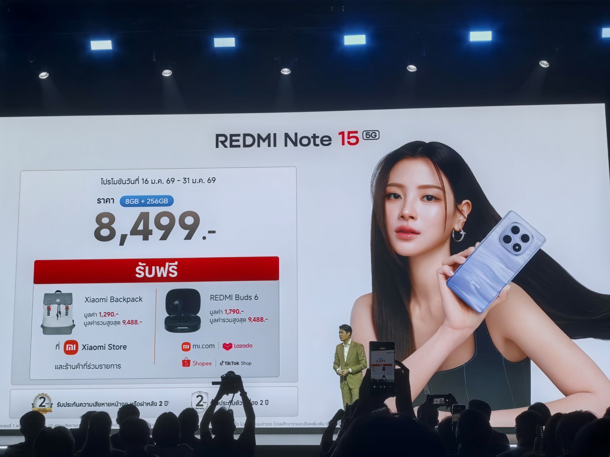 พิเศษ! สำหรับลูกค้าที่ซื้อ REDMI Note 15 5G รุ่นความจุ 8GB+256GB ในระหว่างวันที่ 16-31 มกราคม 2569 ที่ Xiaomi Store และร้านตัวแทนจำหน่ายที่ร่วมรายการทั่วประเทศ รับฟรี Xiaomi Backpack34, รับประกันความเสียหายของหน้าจอหรือฝาหลัง 2 ปี35 และรับประกันตัวเครื่อง 2 ปี35 รวมมูลค่าของสมณาคุณ 9,488 บาท34