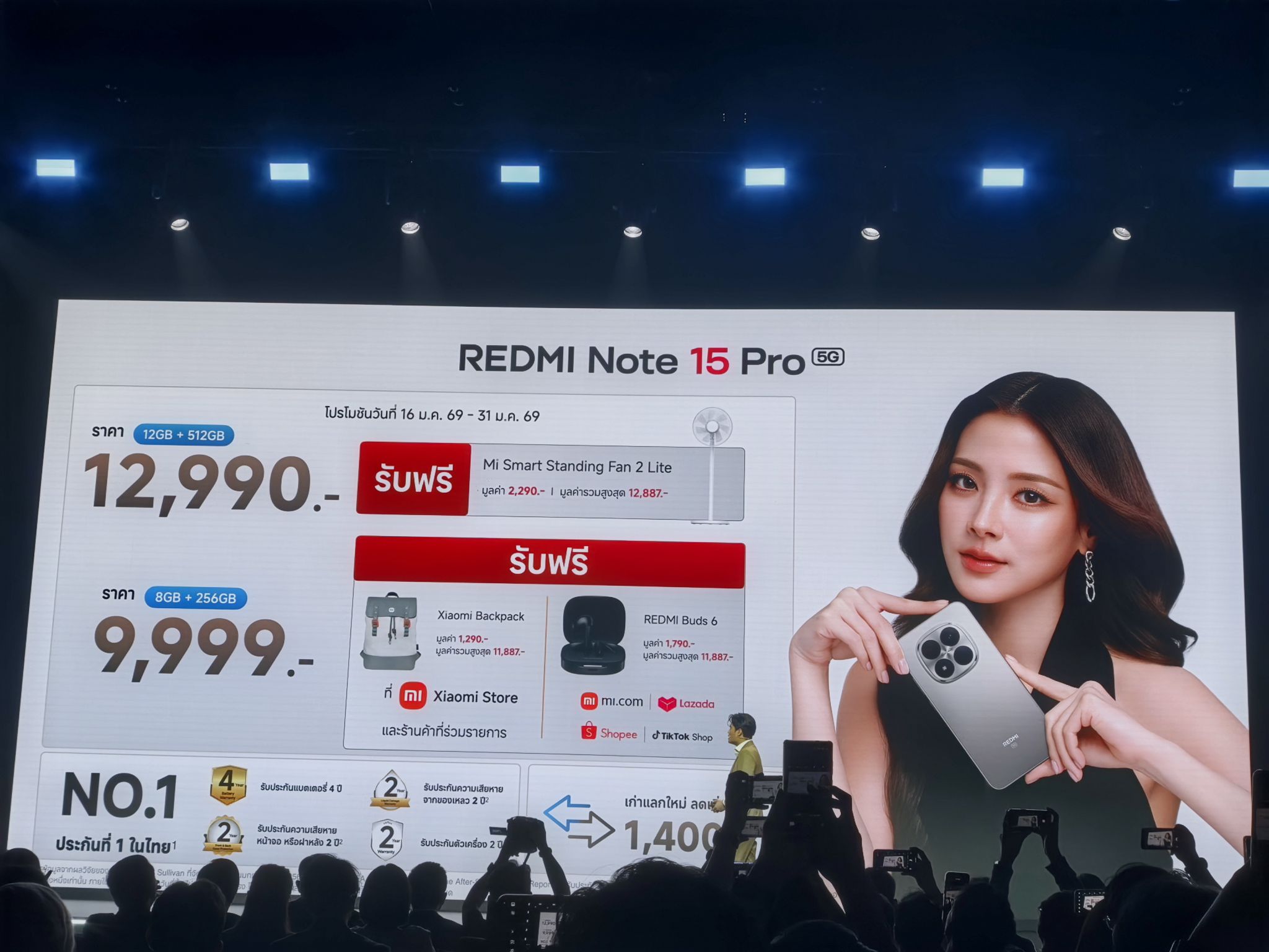 พิเศษ! สำหรับลูกค้าที่ซื้อ REDMI Note 15 Pro 5G รุ่นความจุ 12GB+512GB20 ในระหว่างวันที่ 16-31 มกราคม 2569 รับฟรี Mi Smart Standing Fan 2 Lite, รับประกันแบตเตอรี่ 4 ปี35, รับประกันความเสียหายจากของเหลว 2 ปี35, รับประกันความเสียหายของหน้าจอหรือฝาหลัง 2 ปี35 และรับประกันตัวเครื่อง 2 ปี35 รวมมูลค่าของสมณาคุณ 12,887 บาท34 และลูกค้าที่ซื้อ REDMI Note 15 Pro 5G รุ่นความจุ 8GB+256GB20 ระหว่างวันที่ 16-31 มกราคม 2569 รับฟรี Xiaomi Backpack, รับประกันแบตเตอรี่ 4 ปี35, รับประกันความเสียหายจากของเหลว 2 ปี35, รับประกันความเสียหายของหน้าจอหรือฝาหลัง 2 ปี35, และรับประกันตัวเครื่อง 2 ปี35 รวมมูลค่าของสมณาคุณ 11,887 บาท34 นอกจากนี้ยังนำเครื่องเก่ามาแลกใหม่และรับส่วนลดเพิ่มสูงสุด 2,400 บาท34