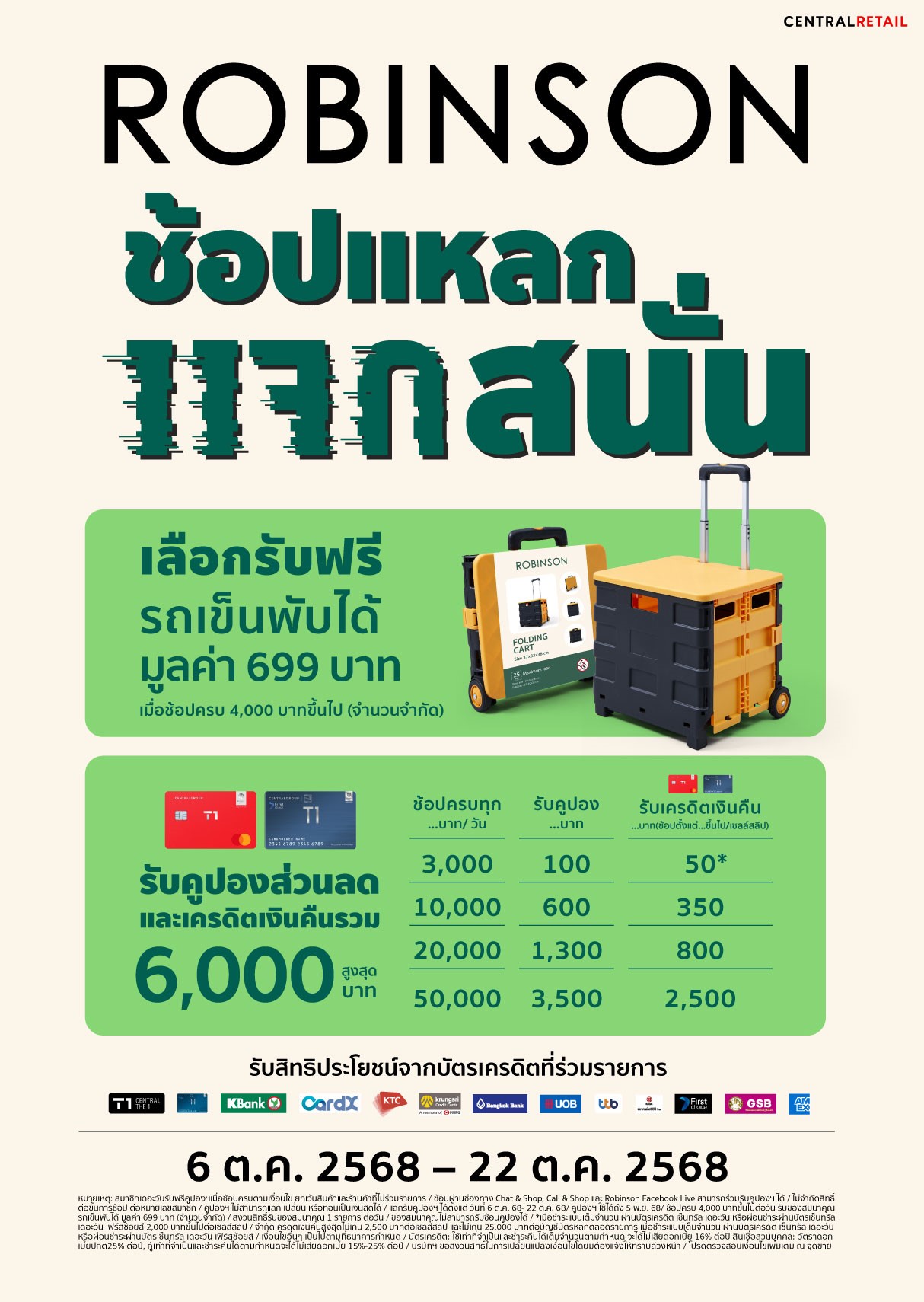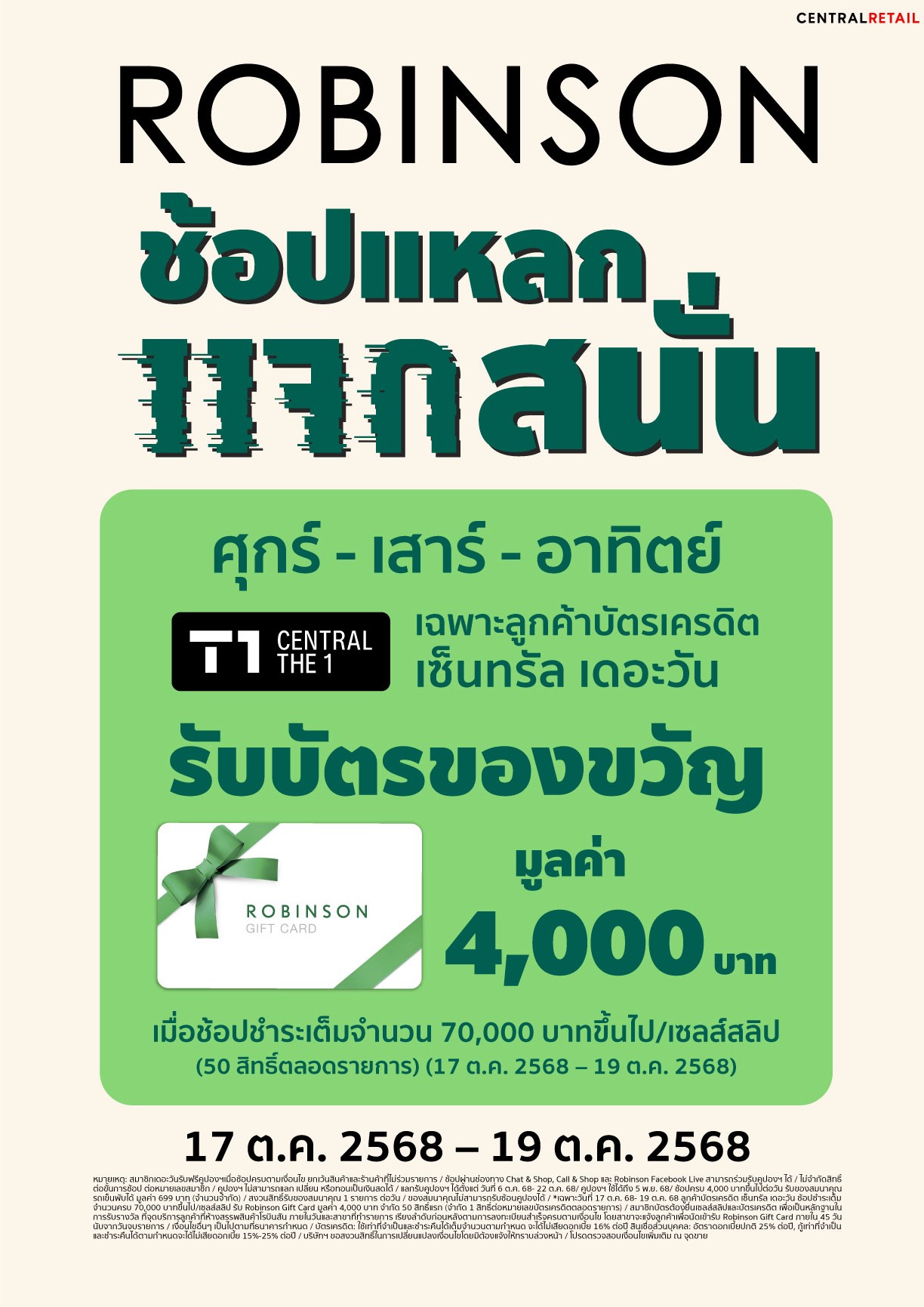 - เฉพาะวันที่ 30 ต.ค. 2568 – 31 ต.ค. 2568 รับทันที! บัตรของขวัญโรบินสัน (Robinson Gift Card) มูลค่า 4,000 บาท เมื่อช้อปครบ 70,000 บาท เฉพาะสมาชิกบัตรเครดิตเซ็นทรัล เดอะวัน