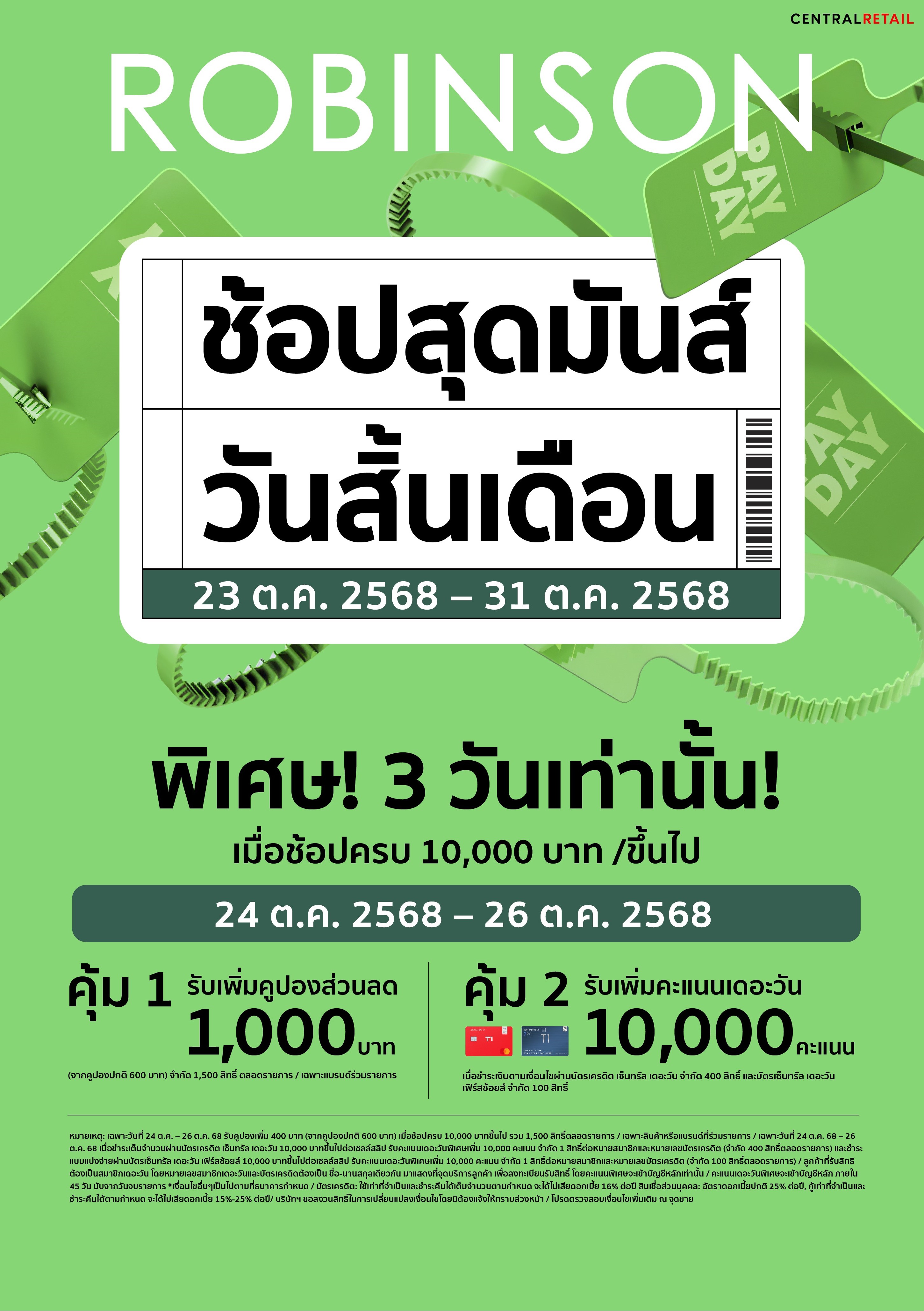 ห้างโรบินสัน ในเครือเซ็นทรัล รีเทล เดสติเนชันที่สร้างความสุขในทุก ๆ วันของชีวิต จัดเต็ม 2 แคมเปญสุดคุ้ม! “ROBINSON ช้อปแหลก แจกสนั่น #3’ และ ‘ROBINSON PAYDAY #9’ ที่มาครบทั้งดีลราคาพิเศษ ของสมนาคุณสุดพรีเมียม และสิทธิพิเศษจากบัตรเครดิตชั้นนำ ให้ทุกครอบครัวทั่วไทยช้อปฟินแบบต่อเนื่องตลอดเดือน ต.ค. 2568 นี้ ที่ห้างโรบินสันทุกสาขาทั่วประเทศ (ยกเว้นสาขาพะเยา, โอเชี่ยน นครศรีธรรมราช, และจังซีลอน) ประกอบด้วย…